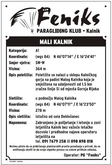 Start je okrenut u smjeru jug - jugozapad i nalazi se podno Sv. Barbare, na nadmorskoj visini 364 m, sletište je u podnožju M.Kalnika, istočno od sela Deklešanec na visini 278 m. Za detaljnije informacije klikni na Feniksovu tablu letjelišta.